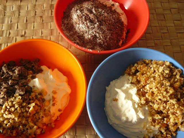 Se opresc trei linguri cu smântână astfel bătută, care se amestecă cu 3 linguri zahăr pudră - și se folosește la ornatul prăjiturii. Restul smântânii se împarte egal în trei castroane.
