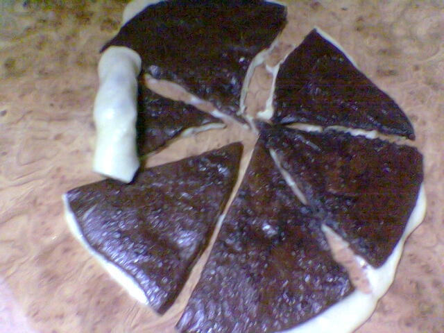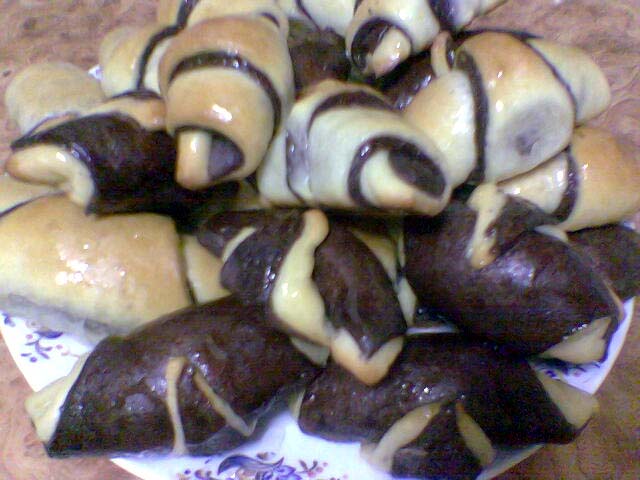 Se întind cu sucitorul, se suprapun, se taie triunghi se umple sau nu, se rulează și se pune în tavă pe hârtie de copt, la foc mic. După ce le scoți din cuptor se îmbăiază în siropul de zahăr rece.
