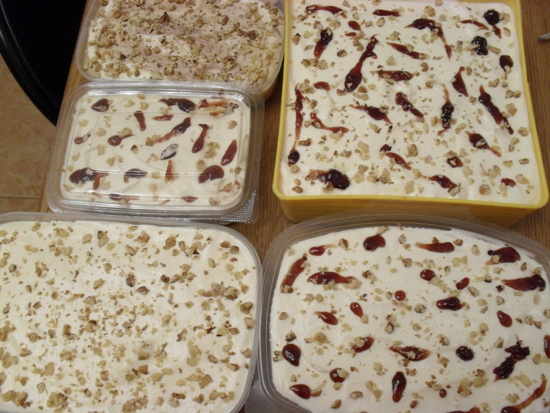 Se obțin astfel cele 3 tipuri de înghețată, care se așează în vasul care va fi dat la congelator în ordinea: III – II – I