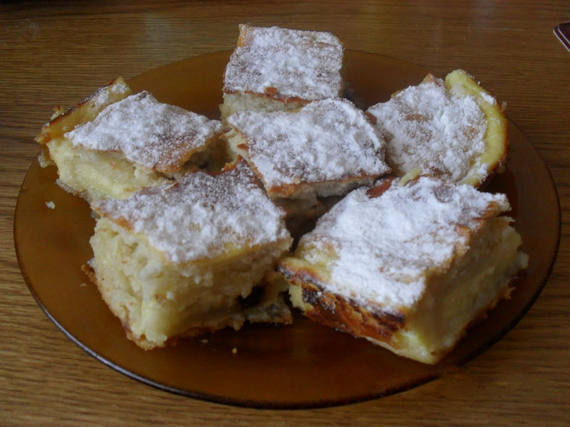 Din iaurt mai păstrăm 2 linguri și-l amestecăm cu 2 ouă. Punem tava la cuptor, iar când s-a rumenit puțin, turnăm cele 2 ouă pe toată suprafața. După ce o scoatem de la cuptor punem zahăr pudră și lăsăm să se răcească.