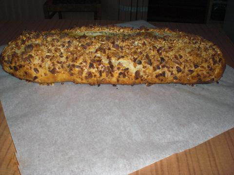 Pe masa de lucru întindem aluatul, cam de 3 mm grosime și repartizăm deasupra compoziția de carne răcită, lăsând liberă o margine de circa 2 cm de jur împrejur. Se ung mărginile cu ou bătut, se rulează ștrudelul și se așează cu pliul în jos, într-o tavă teflonată stropită cu apă rece (sau tavă obișnuită, tapetată cu hârtie de copt).