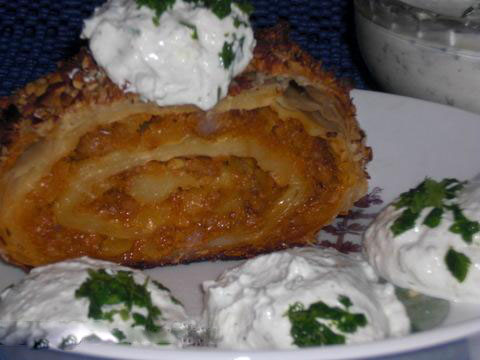 Ștrudelul se servește călduț, tăiat felii, cu sos de iaurt.