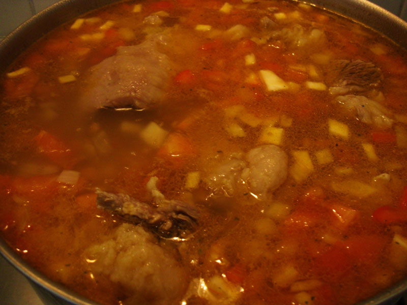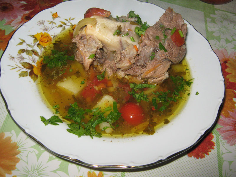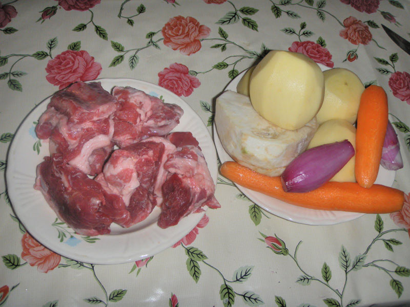 3 cartofi potriviți, 2 morcovi, 2 dovlecei, 1 ceapă, 1 ardei roșu, 1/2 țelină, 1 pătrunjel rădăcină, oase de porc cu cărniță,