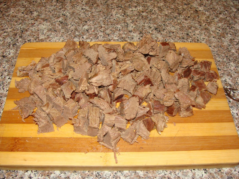 Tăiem carnea cuburi și o punem la fiert în 3,5 l apă rece. Când se formează spuma o strângem cu o spumiera și lăsăm să fiarbă carnea în continuare.