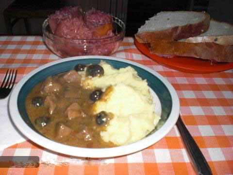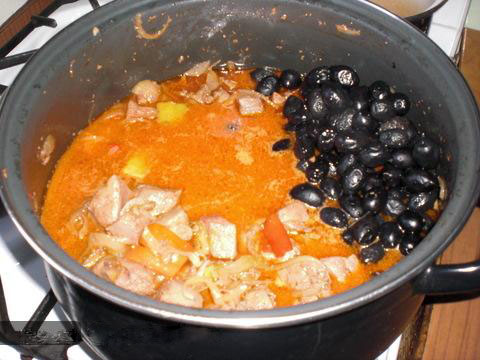 Spre șfârșit se adaugă măslinele desărate (puse de cu seară în apă rece, iar a doua zi se fierb puțin, cu altă apă, apoi se scurg). Când ficatul este făcut se adaugă amidonul desfăcut cu smântână, pătrunjelul tocat, se sareaza și se piperează, după gust. Se mai dau câteva clocote până sosul este legat.