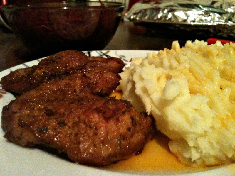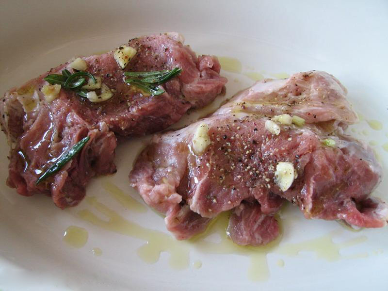 Carne de porc marinată de seară, (lapte, usturoi, rozmarin, ulei de măsline).