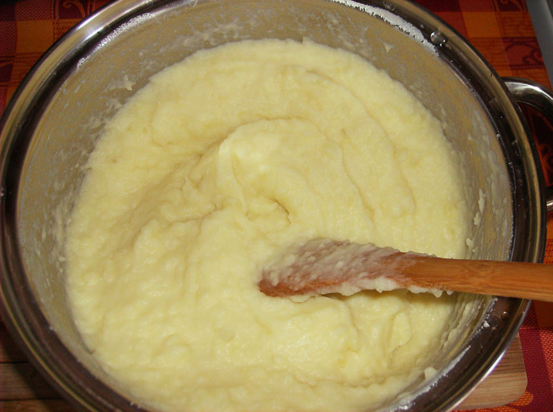 Se pune carnea marinată într-o tavă la cuptor. Între timp se prepară piureul de cartofi (cartofii se fierb în apă într-o oală până când aceștia încep să se crape), scurgem apa, îi pisăm, apoi amestecăm împreună cu laptele, oregano, sarea și piperul.