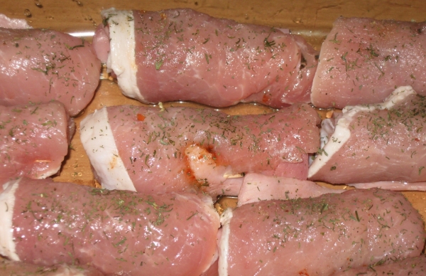 Se amestecă într-un castronaș brânza degresată cu sare, piper +pătrunjel, +oul, până se omogenizează. Se ung feliile de muschiuleț file, cu amestecul de brânză, se pun deasupra legumele și peste fâsiile de ceapă verde.