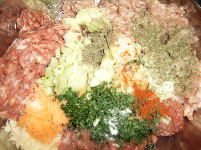 1 kg carne tocată de porc (sau porc și vită-cantități egale), 110 g orez, 3 frunze de dafin, 2 cepe uscate,